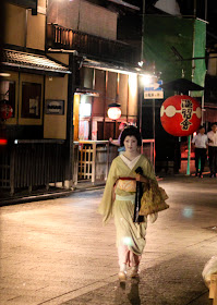 Maiko are the apprentices of Geisha. Generally girls who are aspiring to become Maiko enter an Okiya (Geisha houses) at the age of 15-20 in Kyoto, and are trained for some years, then they are recognized as Geisha. If you spend enough time on the streets of Gion, you might be lucky to spot one of them...but you have to be quick because despite of their uncomfortable platform flip-flops, they move so fast (like ninjas :)) that before you realise it, they will duck out of sight and slip into one of the wooden houses around.